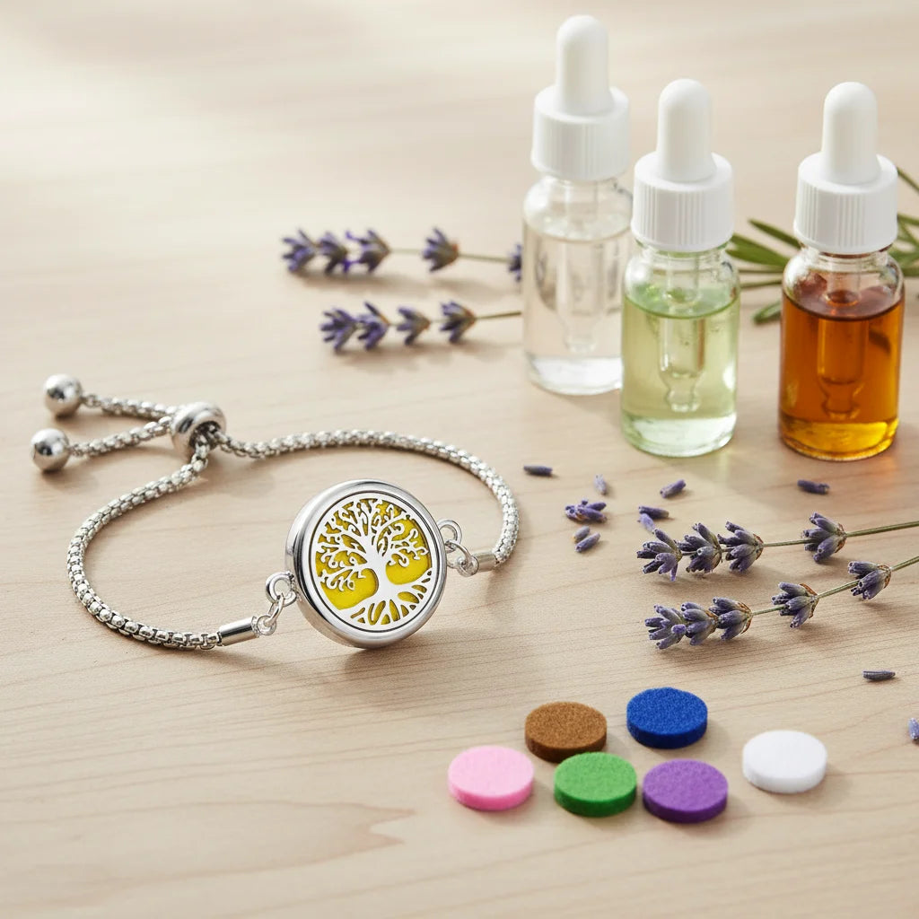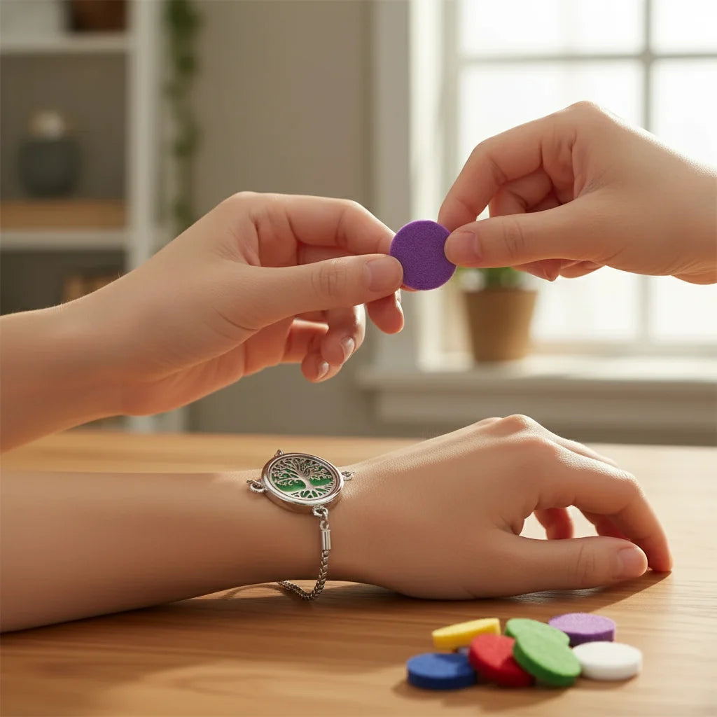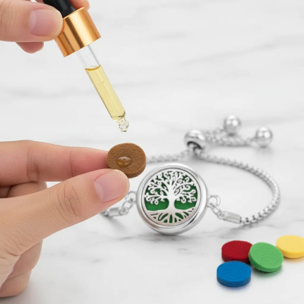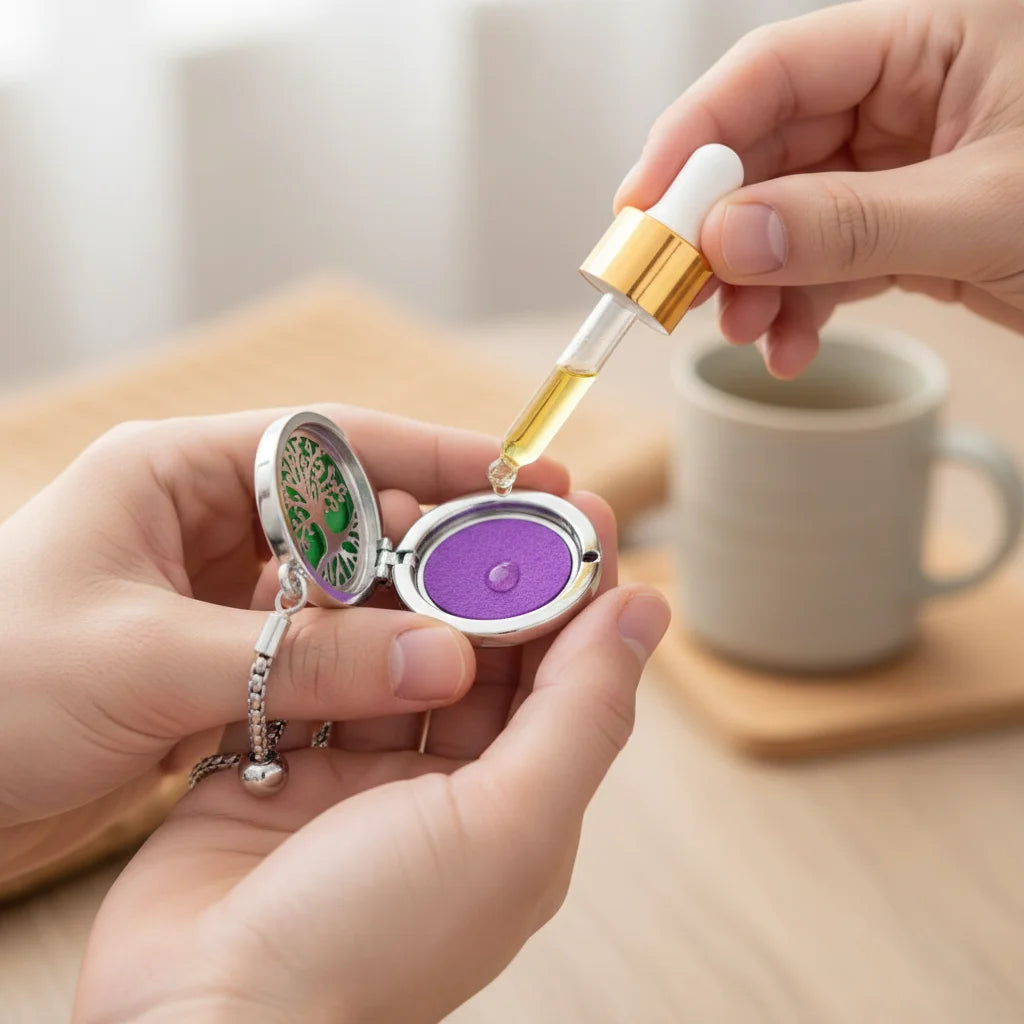 Gently add a few drops of your chosen essential oil onto one of the colorful felt pads. The locket's intricate tree design not only looks stunning but also securely holds the pad, ensuring your scent stays with you all day.